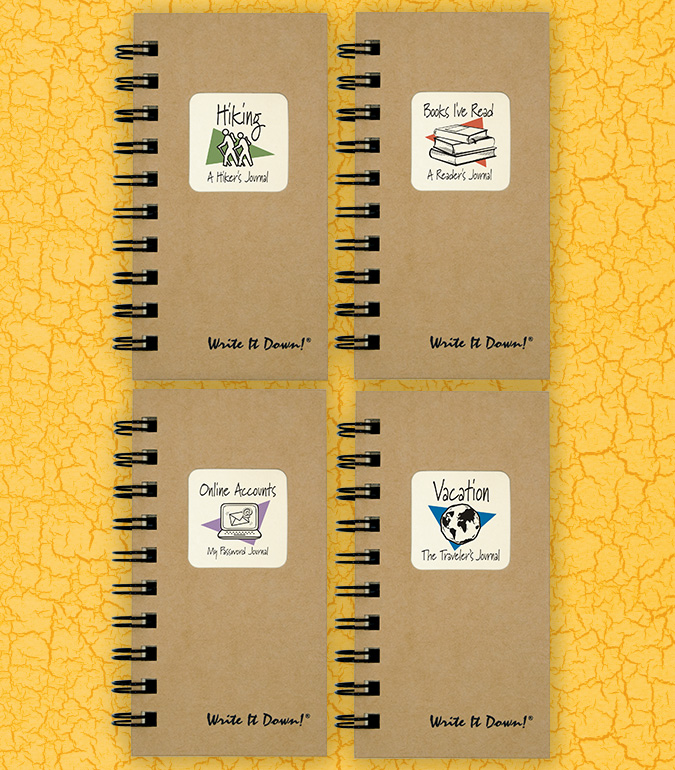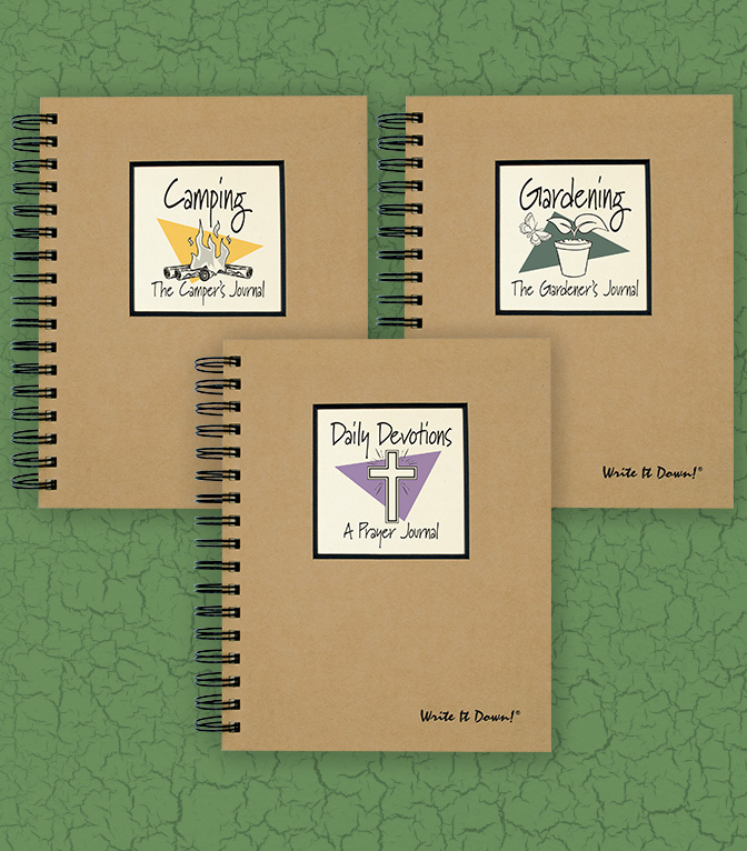 The “Write-it-Down!” Eco-friendly guided journal series is printed in the USA on acid-free recycled paper using soy based ink. The journals have a durable hard cover design and handcrafted look. They are available in two cover styles – Natural Kraft covers and the Color Collection covers.