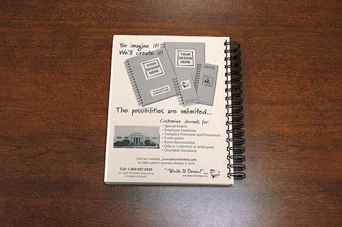 To close the journal, just reverse the opening process. Put on your front cover, then back cover. Turn the spiral as before so that it resembles the picture above. Hold down the spiral on one side and gently press the spiral back together again.If you have any questions, feel free to call. We are more than happy to help. |