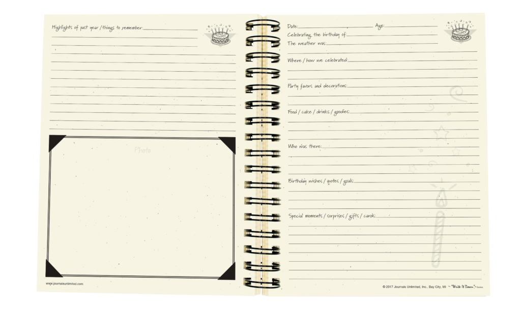 Who doesn’t love birthday celebrations? This unique book helps record every birthday celebration of family (and friends that are “family” too!). Each page is designed to keep the memory of one birthday, anyone’s birthday with questions such as; where/how we celebrated, who was there, wishes and goals, special moments, gifts and cards. The back-side of every birthday page has a spot designated for a photo to help “remember when…”. Whether you celebrate with a quiet dinner at home or a huge surprise party, could you imagine reflecting on all your family’s birthday celebrations all in one place? The front of the book offers a calendar page so that you don’t forget anyone’s special day. Celebrate!