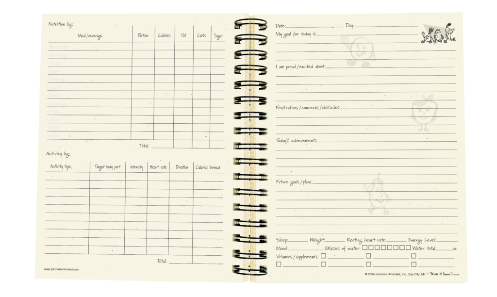 This journal is perfect for the individual who is watching what they eat and how much exercise they are getting. The pages prompt you to log information about the meals of the day along with snacks including portions, calories, fats and carbs. Write down your exercise, goals, frustrations and accomplishments. Studies show you are much more likely to stay the course if you “Write It Down!”