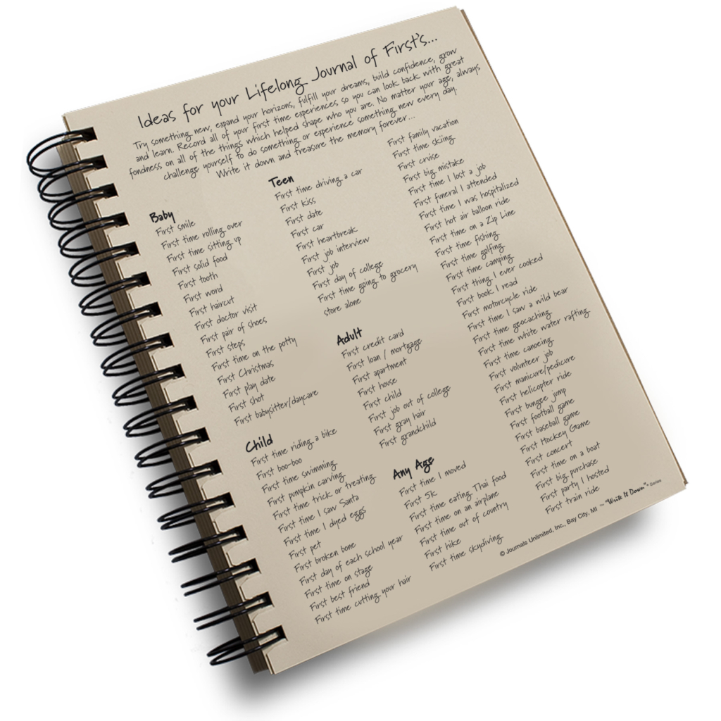 When was the last time you did something for the first time? No matter your age, record life’s milestones – whether it be baby’s first words, your first time riding a bike, your first date, your first home, or your first grandchild. In addition, challenge yourself to do something new every day. Expand your horizons, fulfill your dreams, build confidence, grow and learn. This journal will allow you to look back with great fondness on all of the things which helped shape who you are.  We all do something for the first time more often than is realized, even as adults… start writing it down and treasure the memories forever.