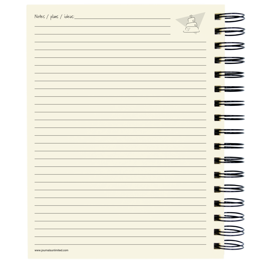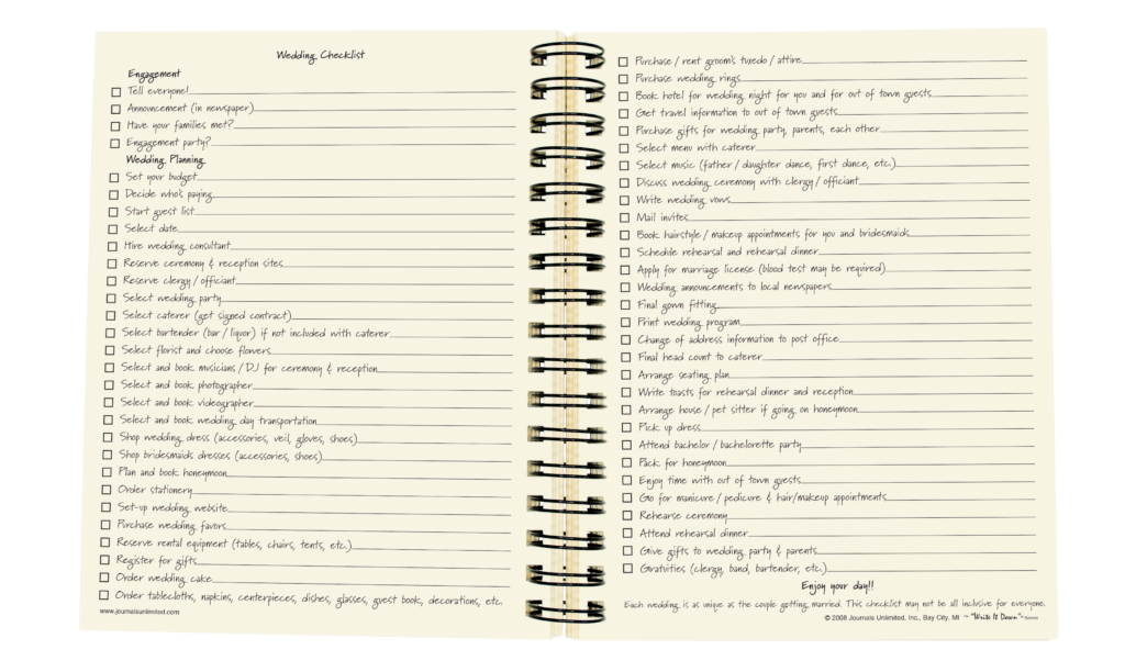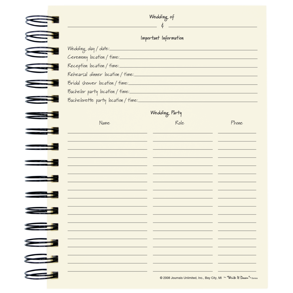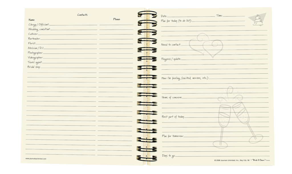 Finally!!! An all-inclusive journal to plan your big day! Includes a page for important dates, members of your wedding party, their roles and phone numbers, 2-page wedding checklist, and a contacts/phone page for easy reference to caterer, photographer, bridal shop etc. Additional pages allow you to plan, update your progress, and record your excitement and concerns. It even has a countdown for “days to go”.