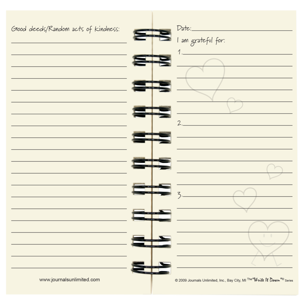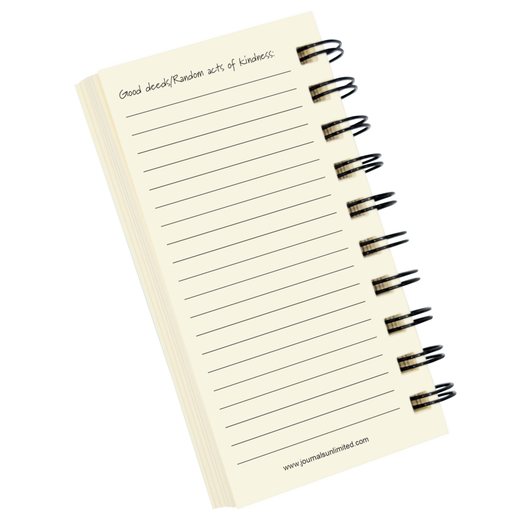 Count your blessings. Each night before bed write down 3 good things about the day. Drifting off with positive thoughts in your mind, can help you sleep better – and getting more sleep will reduce your stress and make you feel more positive the following day. To really feel good – complete at least one random act of kindness each day and journal about it on the reverse side of each page. Imagine how the world would change if everyone did this!