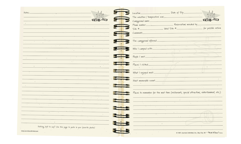 I was given this journal as a gift when I purchased an RV from a friend. It has documented all of our trips so far (8). I also tape a few small photos to the back of each page. Even though it has only been a year, we already look back and laugh at how small our children were. I highly recommend these, and will be buying them for friends in the future.