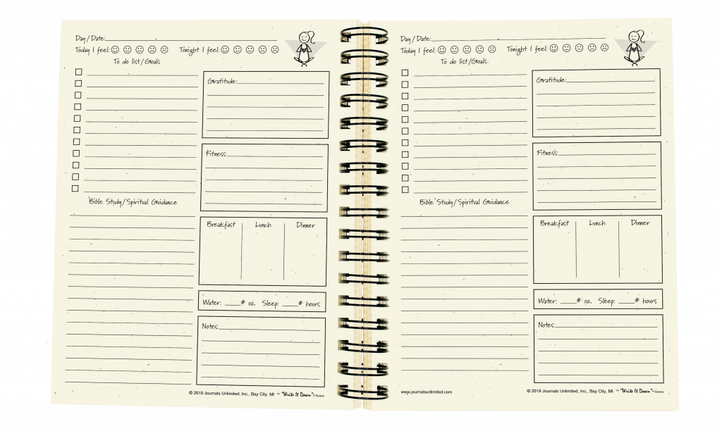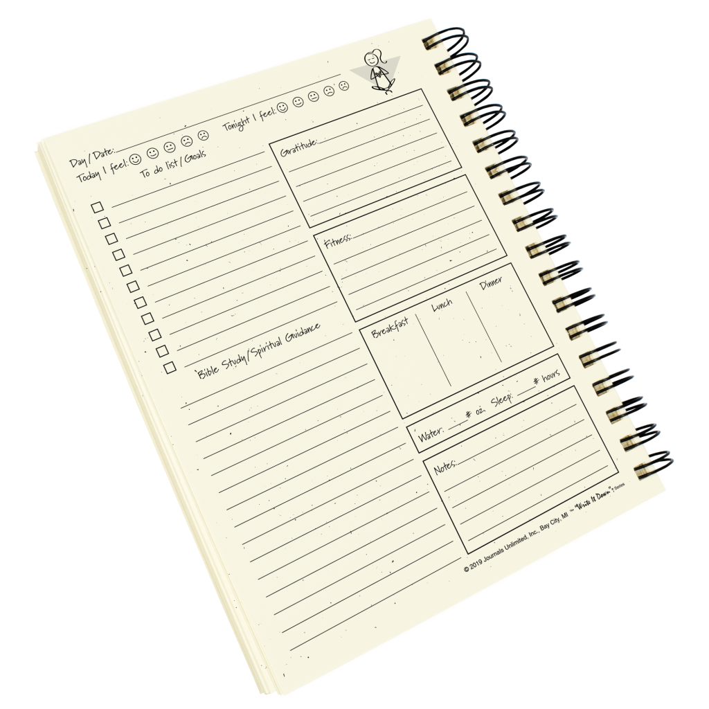 This journal is truly a one-stop-journal for mind, body, and spirit.  The unique layout includes space for your daily “to-do” list, appointments, and goals. Each page also allows you to add notes on gratitude, fitness, water intake, sleep and Bible Study. Whether you have a busy schedule at work or school, volunteering, or you are busy playing taxi-driver to your kids; this is the journal for you! The best part is that it is undated so no wasted pages!