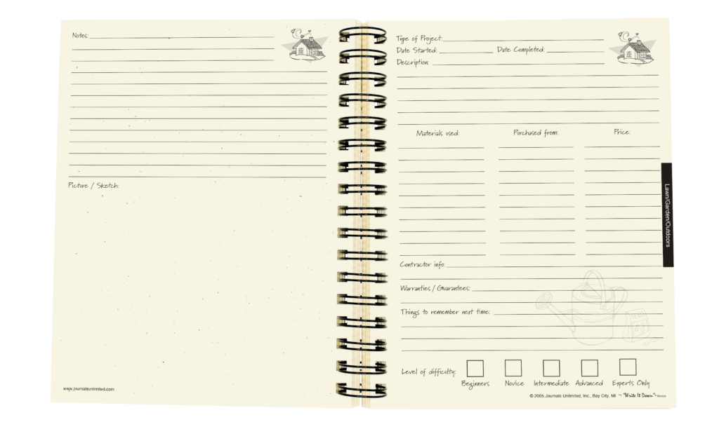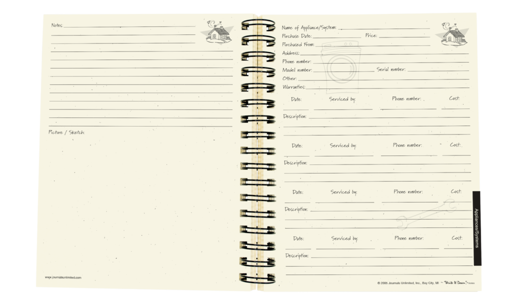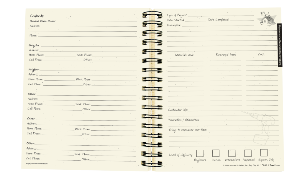 A great gift for the new homeowner! Finally a place to record and log all of your house repairs, remodeling projects, garden/landscape improvements, contractor info, appliance warranty and service information. Plus we have pages for names and numbers of all your service providers and neighbors. What a great tool to have your house history in one place. No more need to dig through file cabinets to find dates of projects, contractor names/numbers, and warranty info. With our new option, “Personalize It”, you can print a picture of your own house on the cover, with your name and/or address. Hey Realtors… this makes a great closing gift!