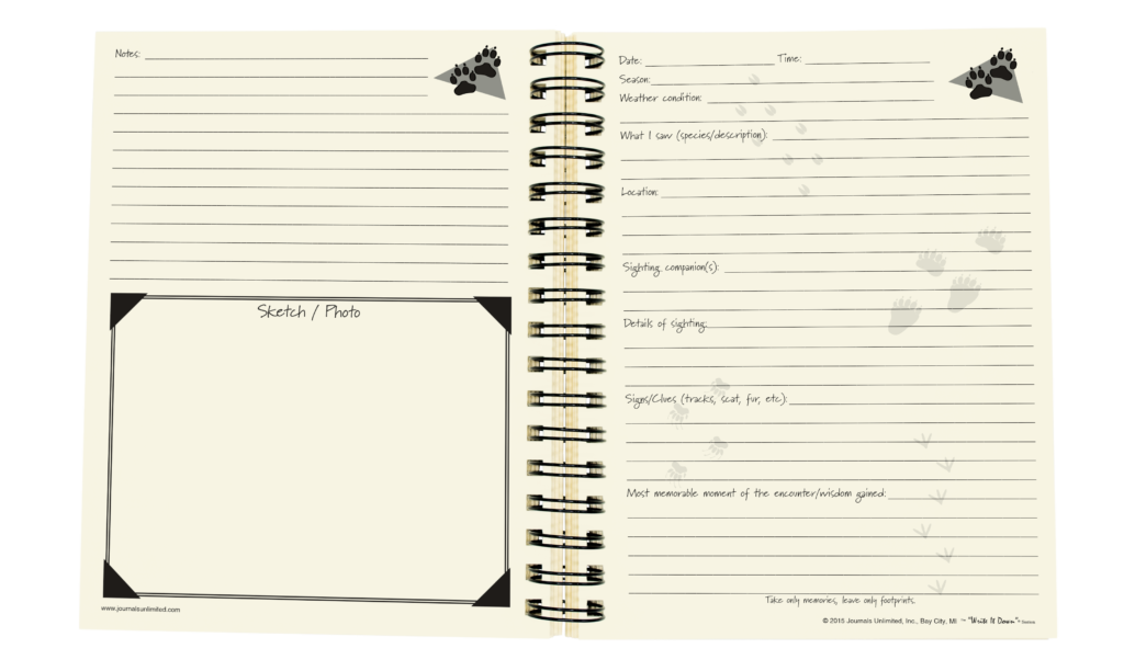 A definite must for anyone who is WILD about nature. Whether they find you or you find them… it is perfect to track all of your wildlife encounters, from rabbits to grizzlies! It even has a place for a photo/sketch for those lucky enough to get a close up view. Allows you to record amazing details about the wild things you encounter.