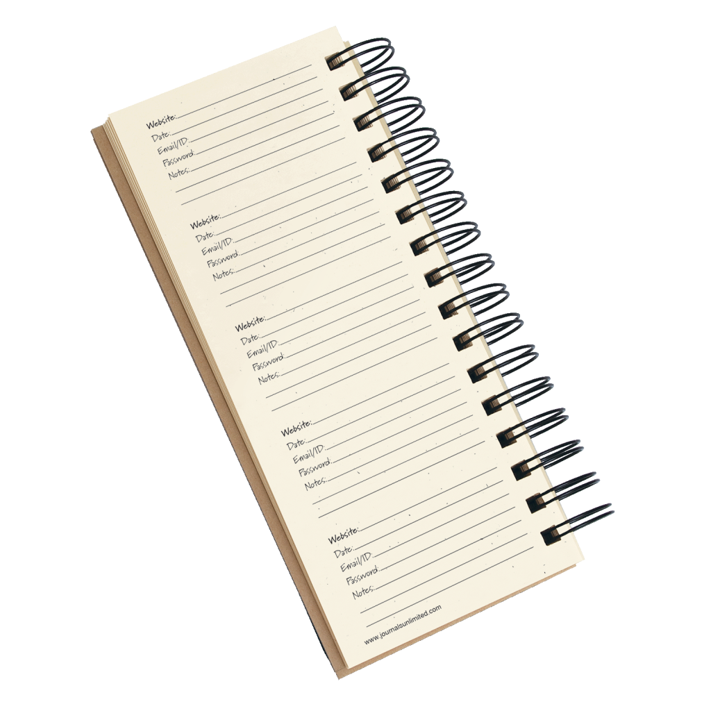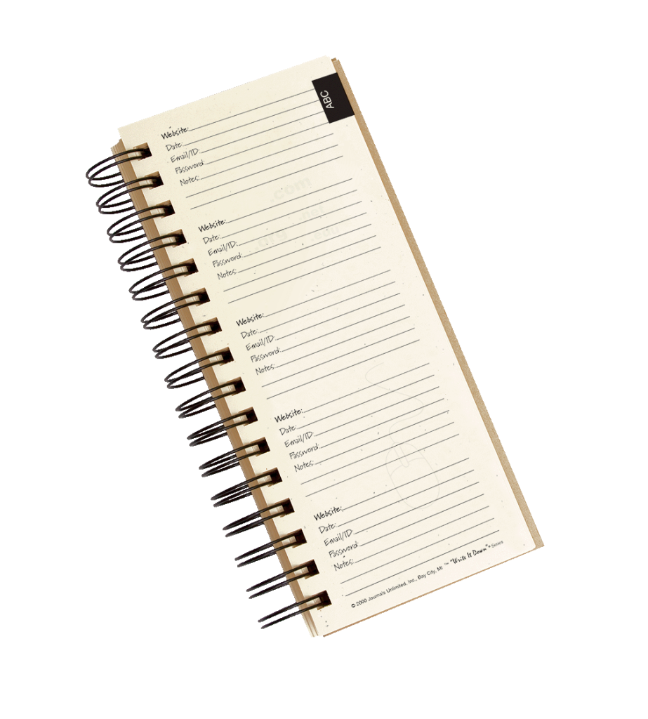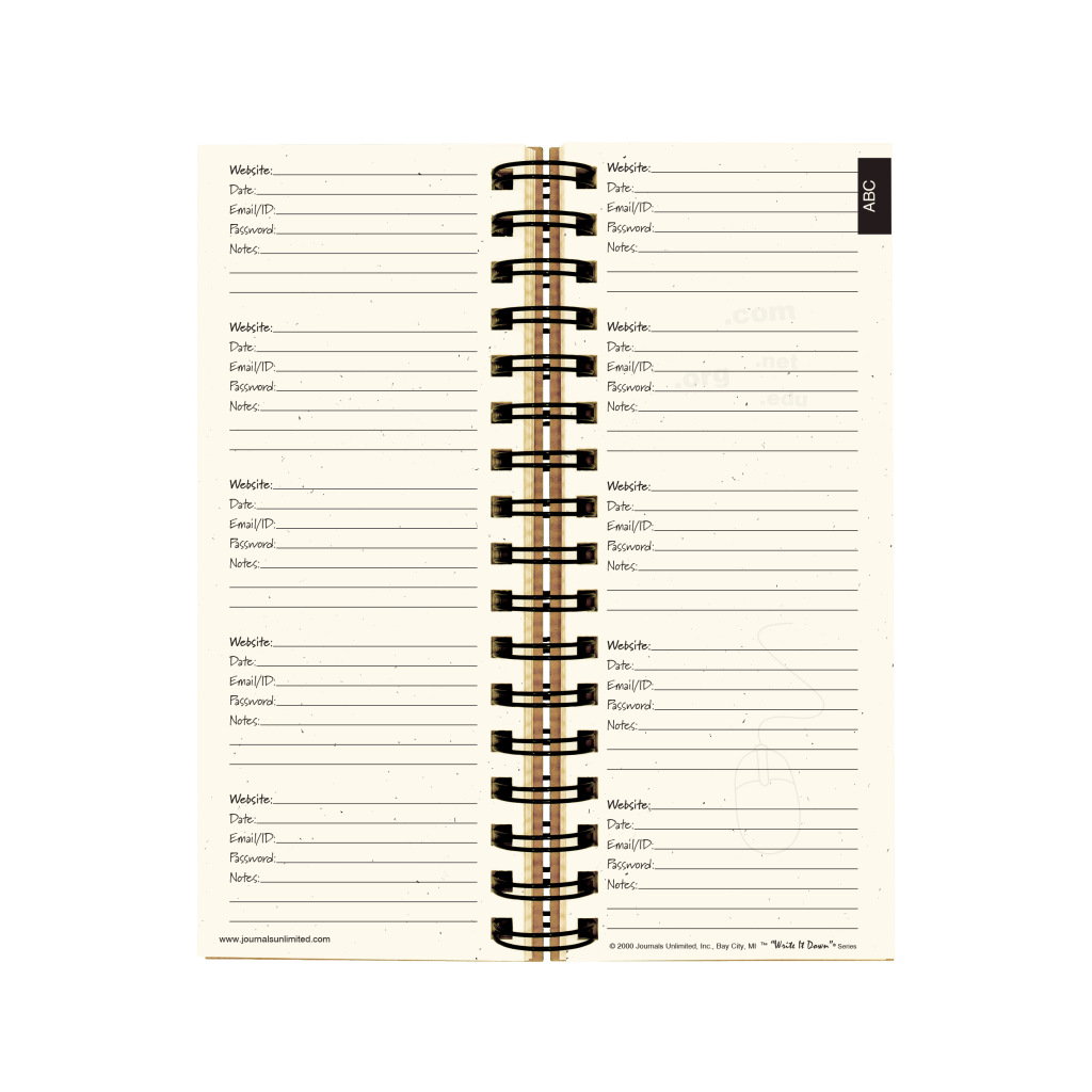 A classic Journals Unlimited title, back in mid-size by popular demand!  Keep track of your login and password information in the perfect size journal; enough space for  writing but compact enough to slide into your desk drawer.  Tabbed alphabet pages help keep locations of websites organized and easy to find!