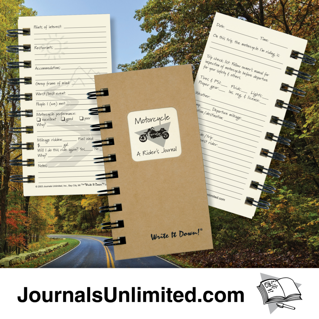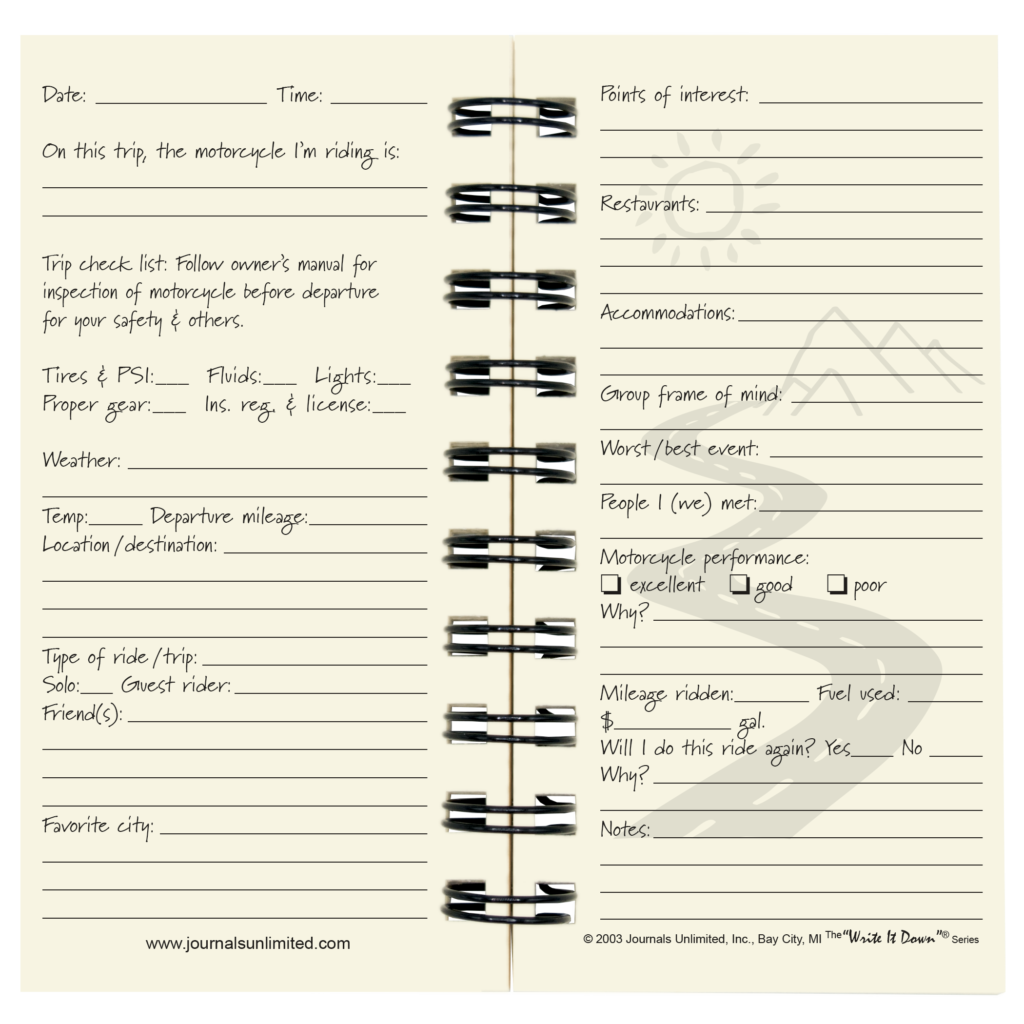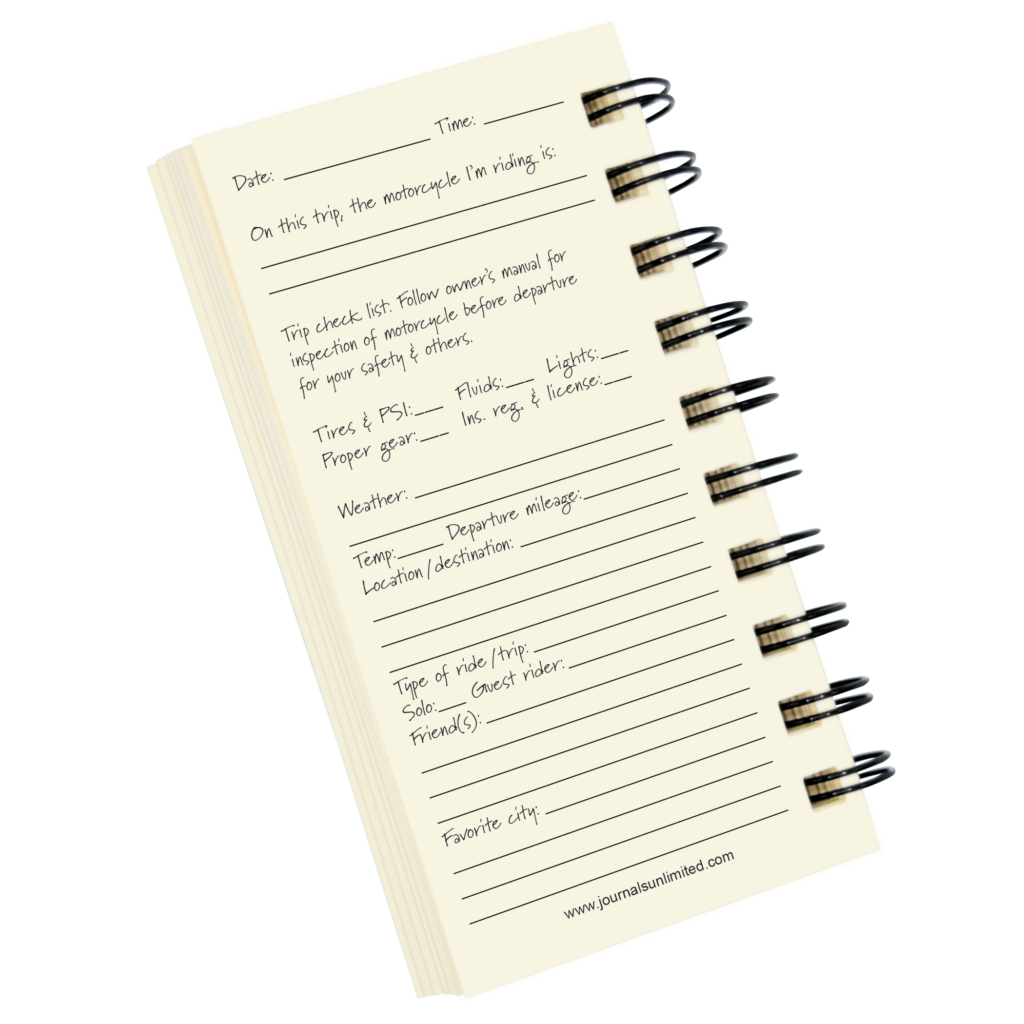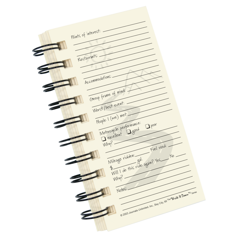 Born to Ride! This Mini Size is a must have for every ride. It prompts for safety checks, destination, miles ridden, weather, points of interest, new friends met, and contacts for another memorable ride. Best of all, fits nicely in your pocket or saddle bags. When you’re on your bike, no one ever asks “are we there yet?”.